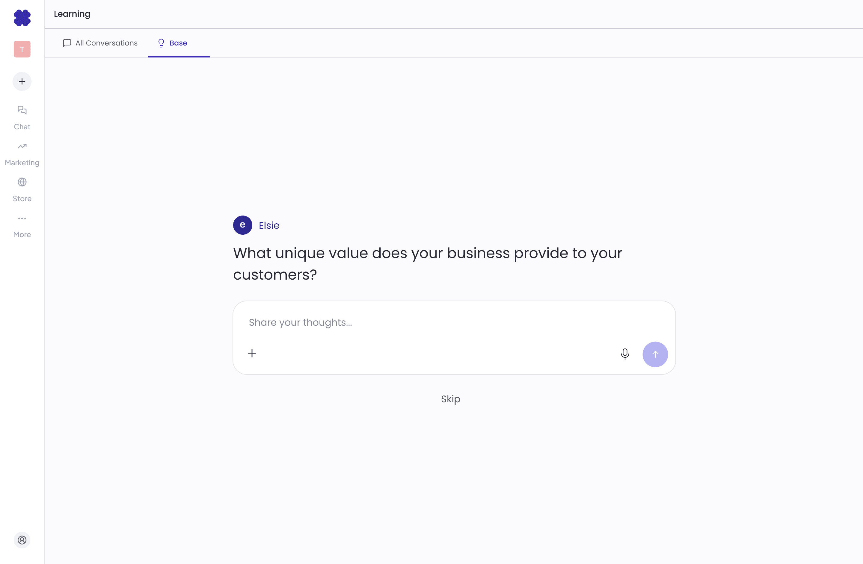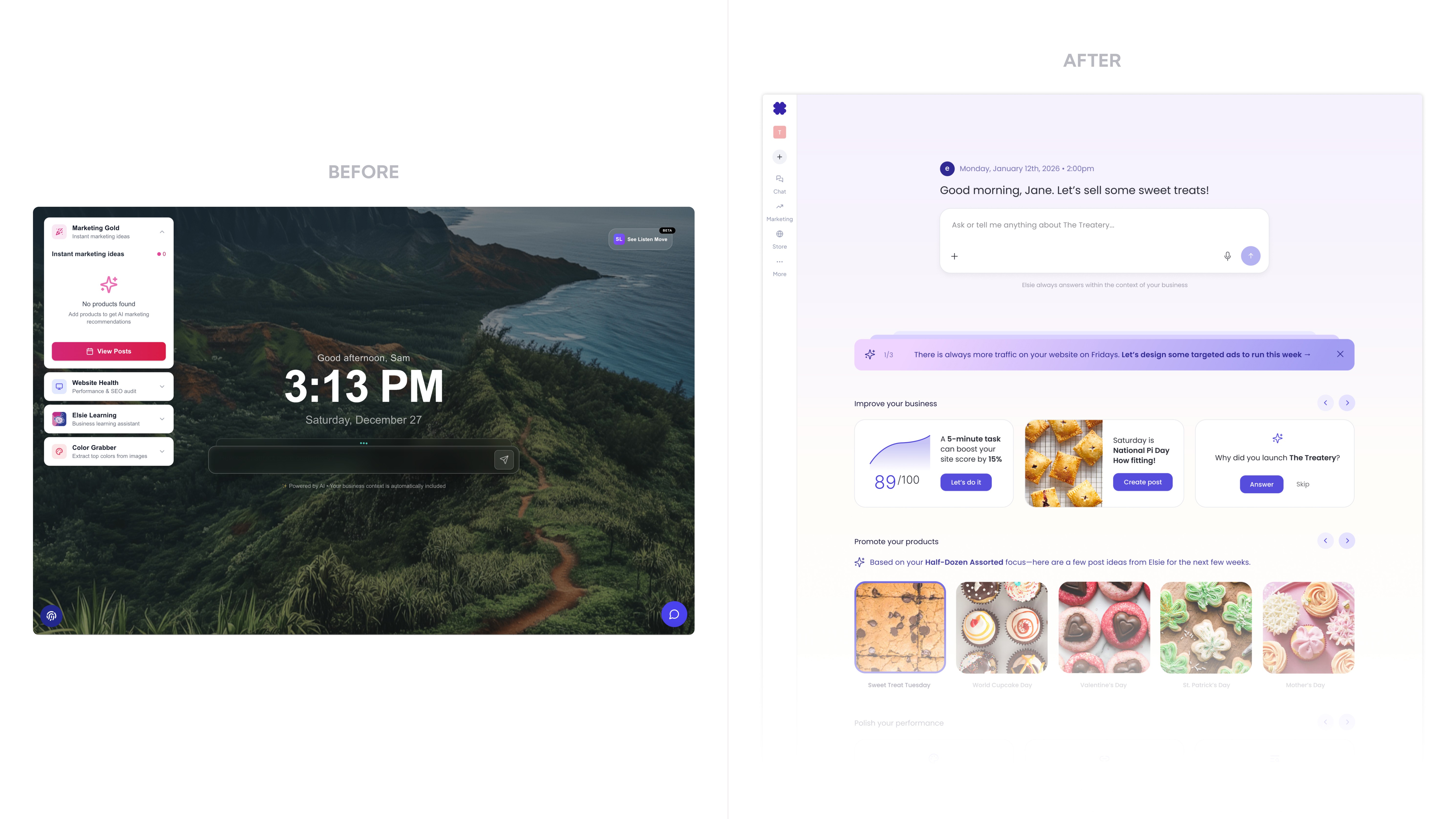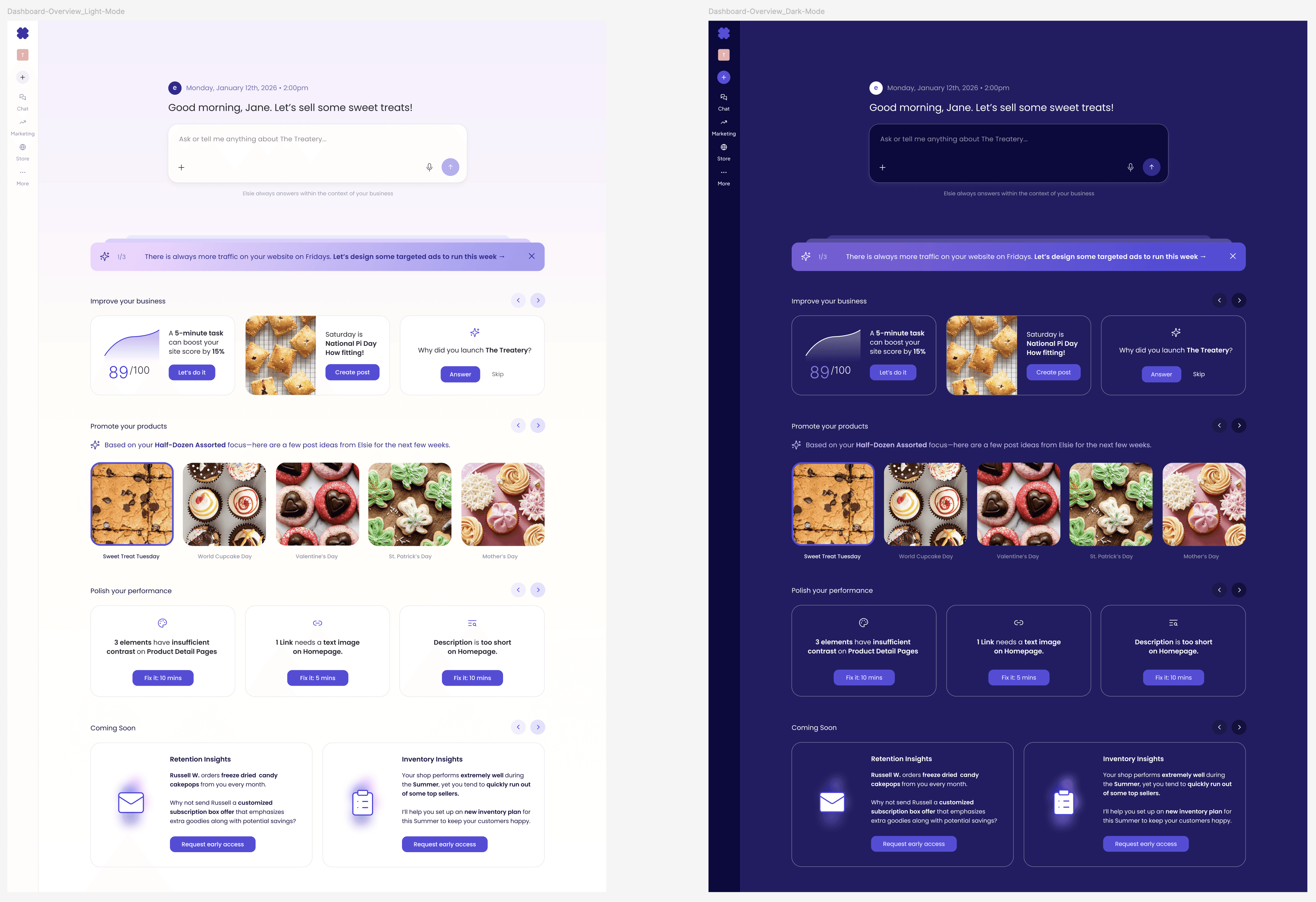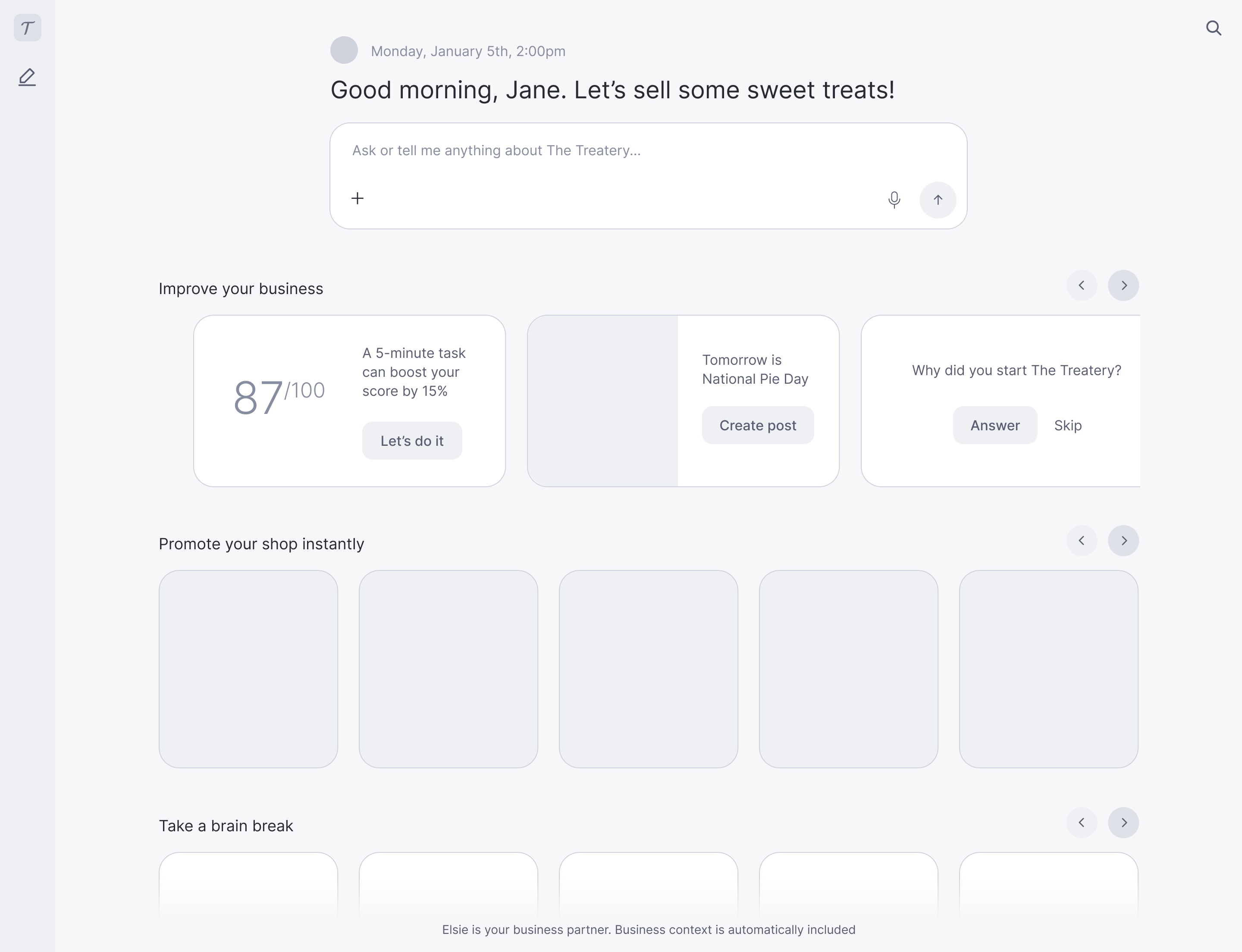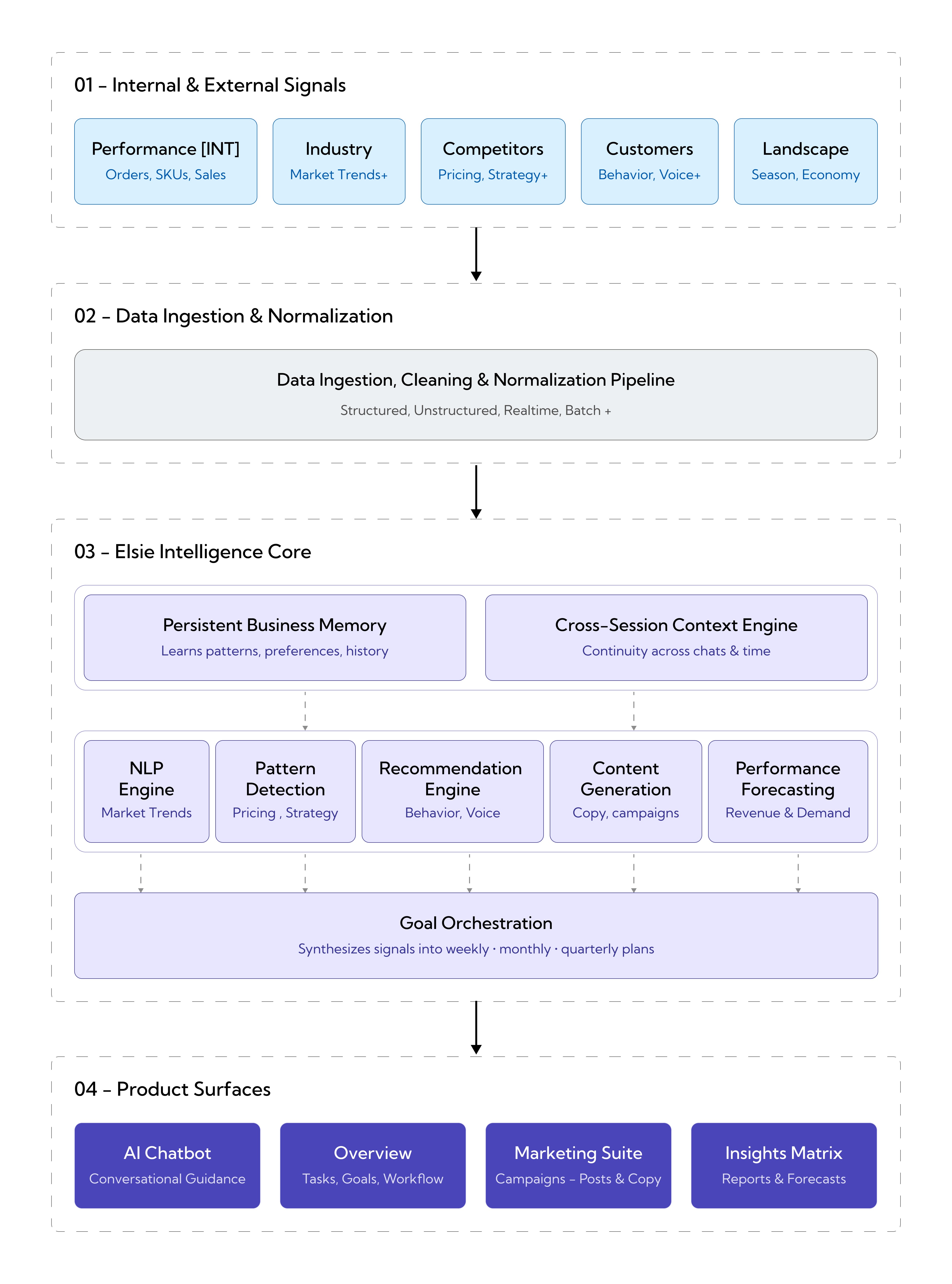 My role was to design Elsie from end-to-end, taking it from 0 to 1, shaping it into a unified ecosystem of business support and guidance. At its core, Elsie was created to help SMB owners navigate operational questions, marketing decisions, and next-step execution through a conversational, context-aware experience. Elsie’s key differentiator lies in its ability to guide users smoothly from question to recommendation to action, reducing the friction, confusion, and overwhelm often created by the solo entrepreneur's dilemma of having to juggle countless fragmented tools.