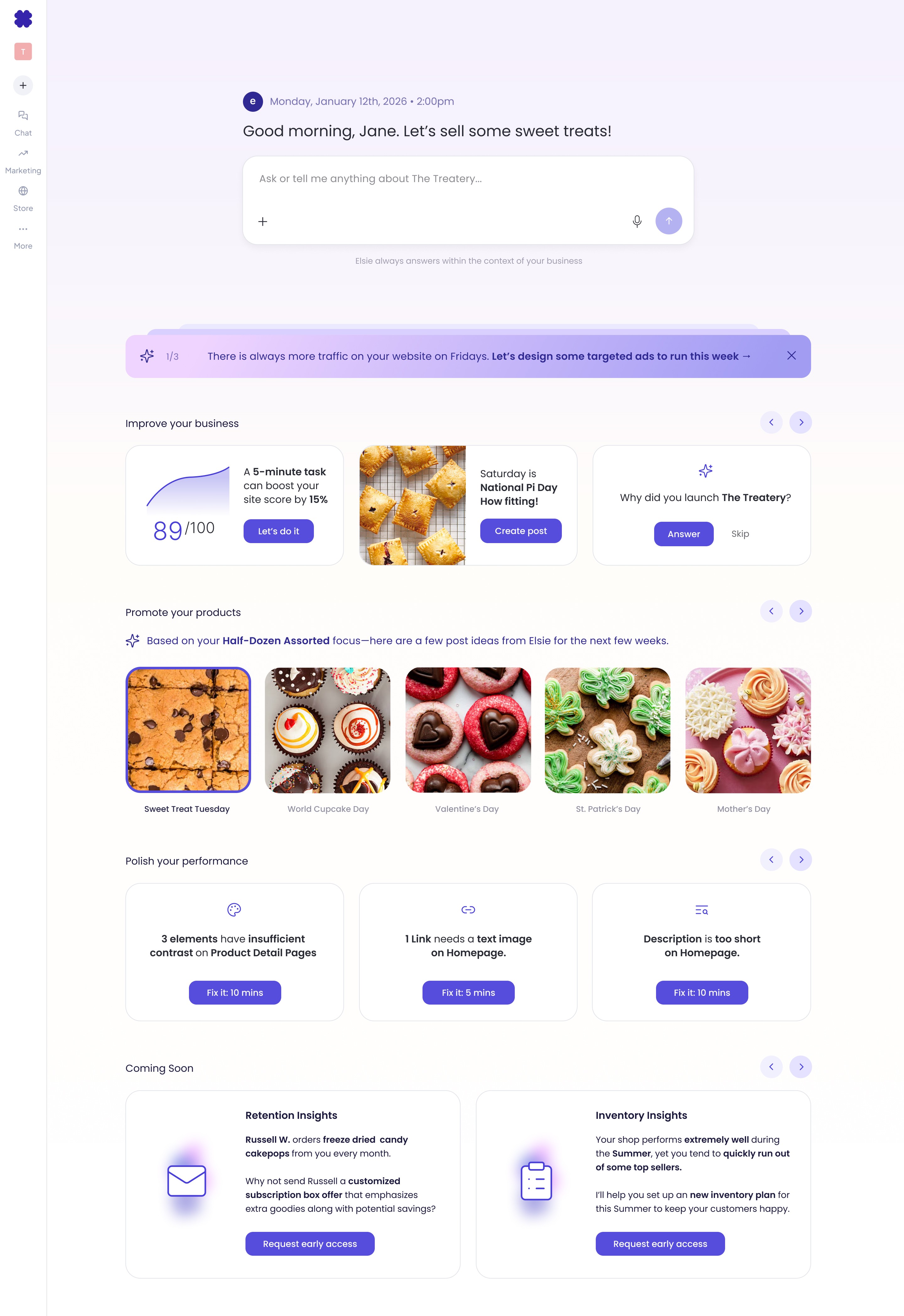 Elsie is an AI-powered ecommerce business partner designed to learn the patterns of a business and turn industry, competitor, and customer data into intuitive, actionable guidance. Built for e-commerce SMB owners, it helps users plan, prioritize, and achieve weekly, monthly, and quarterly goals while supporting smarter decision-making at every stage. By handling day-to-day operational support and expanding its capabilities over time, Elsie enables business owners to stay focused on growth, clarity, and long-term vision.