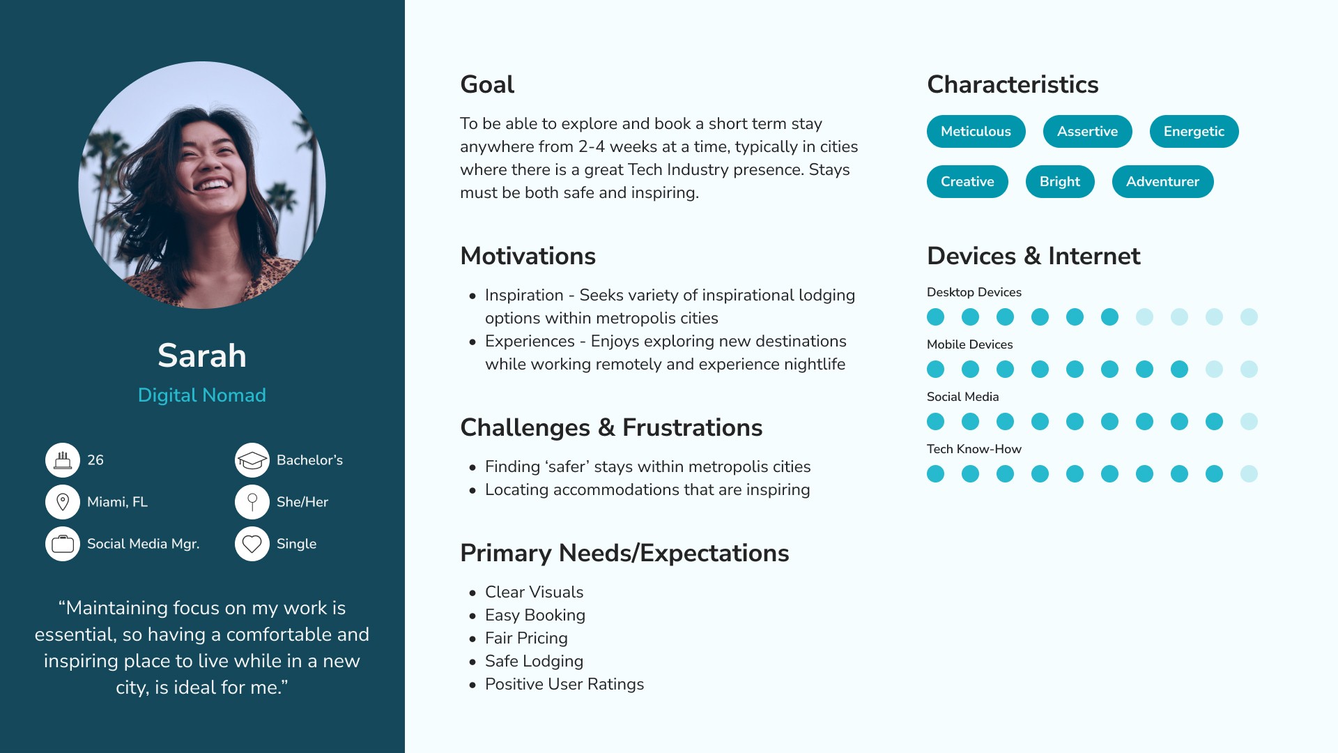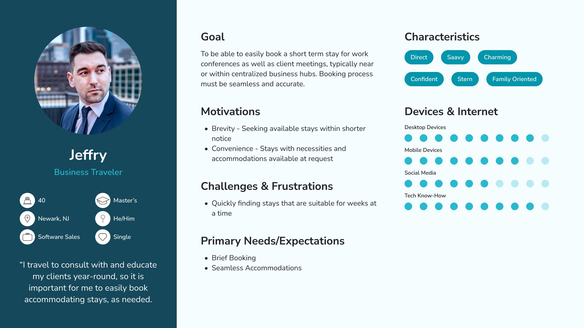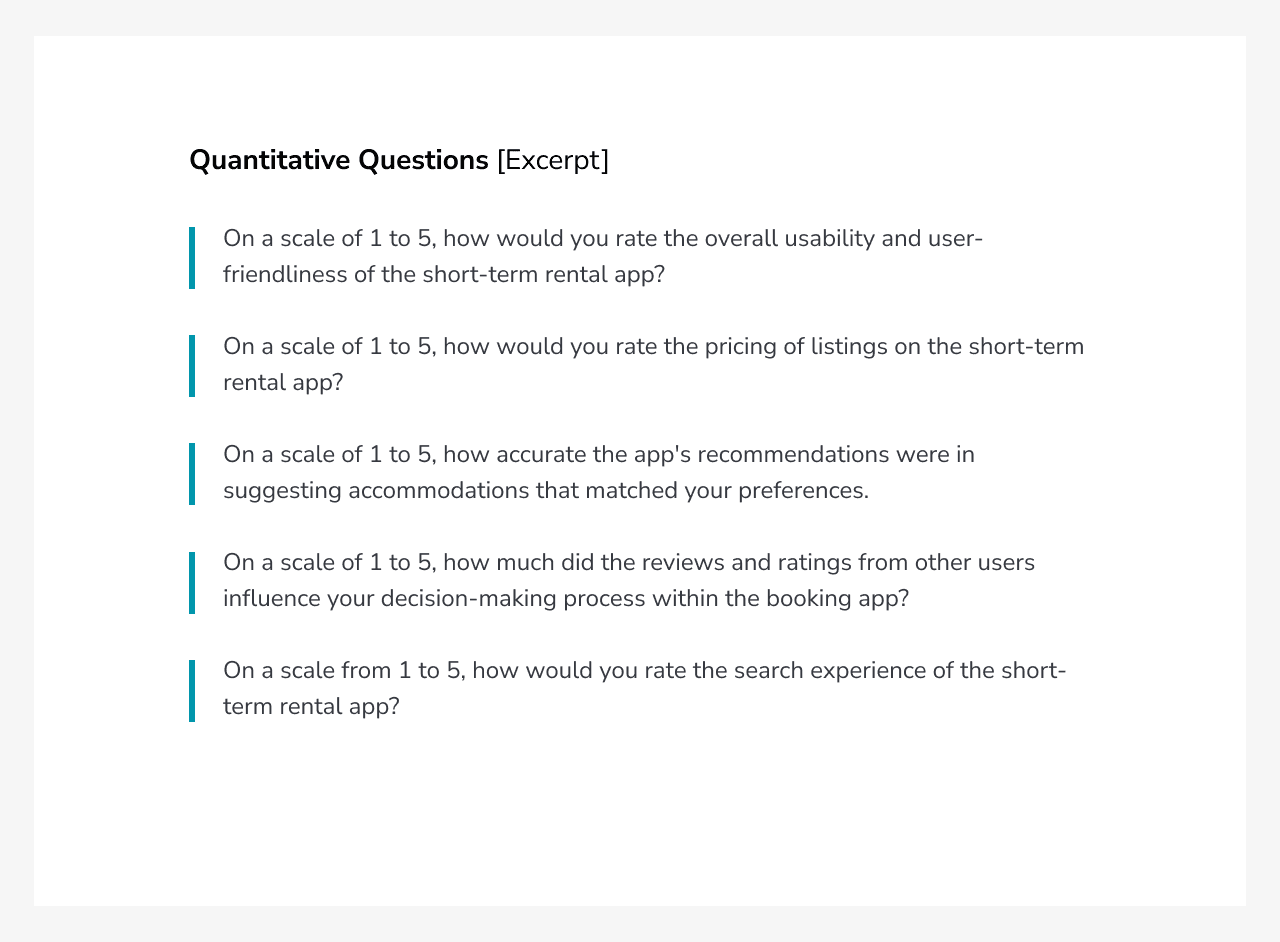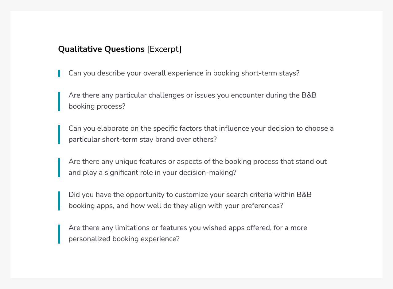 I developed specific groups of non-leading, qualitative & quantitative questions and listened back to responses from multiple individuals who had varying experiences with booking short-term stays.