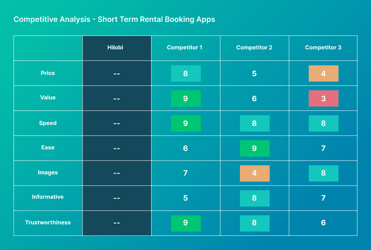 After holding several discovery meetings with the Hilobi team, I conducted research in order to gain a deeper understanding of the short-term rental & hospitality space and Hilobi's potential direct and indirect competitors. I then replicated the booking process of 3 most adjacent brands through interactive prototypes and queued them in for a round of user testing. Additionally, I designed visuals to effectively discuss the attained data, as related to the brand's goals and aspirations.